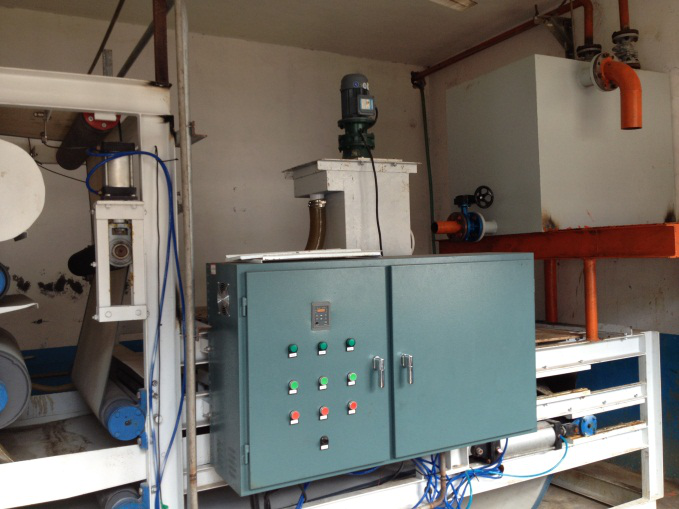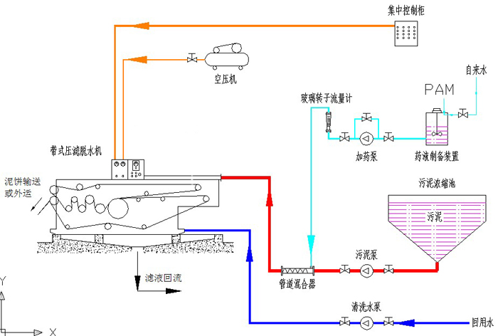 物料經(jīng)投料器加絮凝劑進(jìn)入絮凝劑混合器反應(yīng)后流入重力預(yù)脫水段;物料在重力的作用下進(jìn)行過濾。經(jīng)兩道預(yù)脫水的物料隨著上、下濾帶不斷向前移動(dòng)(上下濾帶由變頻調(diào)速器控制的傳動(dòng)機(jī)構(gòu)驅(qū)動(dòng)),首先進(jìn)入“鍥”形壓榨段;在“鍥”形壓榨中,一方面使物料平整,另一方面使物料受到輕度壓力使物料脫水;其次進(jìn)入“S”形壓榨段,在“S”形壓榨段中,物料被夾在上下兩層濾帶中間經(jīng)若干個(gè)不同口徑的輥筒反復(fù)壓榨對(duì)物料形成剪切作用,使物料脫水。脫水后的濾餅經(jīng)刮刀將濾餅刮落,而上下濾布繼續(xù)前移清洗后重新進(jìn)入下一個(gè)工作循環(huán)。整個(gè)過程周而復(fù)始的連續(xù)進(jìn)行。