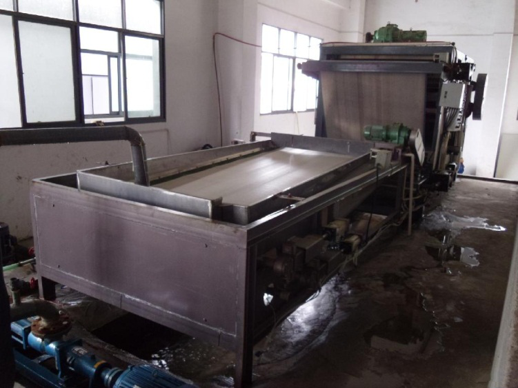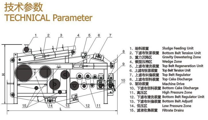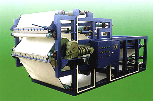 物料經(jīng)投料器加絮凝劑進(jìn)入絮凝劑混合器反應(yīng)后流入重力預(yù)脫水段;物料在重力的作用下進(jìn)行過濾。經(jīng)兩道預(yù)脫水的物料隨著上、下濾帶不斷向前移動(dòng)(上下濾帶由變頻調(diào)速器控制的傳動(dòng)機(jī)構(gòu)驅(qū)動(dòng)),首先進(jìn)入“鍥”形壓榨段;在“鍥”形壓榨中,一方面使物料平整,另一方面使物料受到輕度壓力使物料脫水;其次進(jìn)入“S”形壓榨段,在“S”形壓榨段中,物料被夾在上下兩層濾帶中間經(jīng)若干個(gè)不同口徑的輥筒反復(fù)壓榨對(duì)物料形成剪切作用,使物料脫水。脫水后的濾餅經(jīng)刮刀將濾餅刮落,而上下濾布繼續(xù)前移清洗后重新進(jìn)入下一個(gè)工作循環(huán)。整個(gè)過程周而復(fù)始的連續(xù)進(jìn)行。